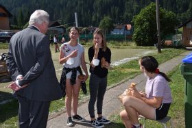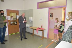 Neben zufälligen Begegnungen mit den Schülern am Pausenhof freute sich der Landeshauptmann auch über die nette Begrüßung durch die Volksschulkinder und ein Paket mit regionalen Spezialitäten.